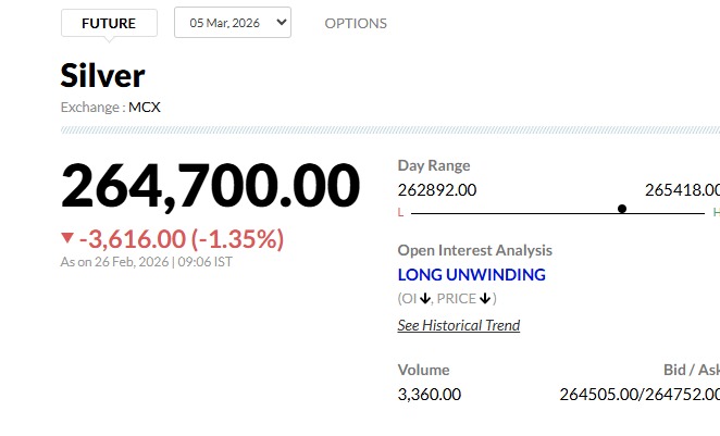 Gold and Silver News Today: मल्टी कमोडिटी एक्सचेंज (MCX) पर आज सोने और चांदी की कीमतों में गिरावट दर्ज की गई है. वैश्विक बाजार के संकेतों और घरेलू मांग में कमी के चलते सोना - चांदी दाम लाल निशान पर कारोबार कर रहे हैं.एमसीएक्स पर 2 अप्रैल, 2026 की डिलीवरी वाले सोने के भाव में आज नरमी देखी जा रही है. 26 फरवरी की सुबह 09:06 बजे तक, सोना ₹548.00 (0.34%) गिरकर ₹160,597.00 पर आ गया है. चांदी की कीमतों में आज सोने के मुकाबले अधिक गिरावट देखने को मिल रही है. 5 मार्च, 2026 की एक्सपायरी वाली चांदी सुबह 09:06 बजे तक ₹3,616.00 (1.35%) की बड़ी गिरावट के साथ ₹264,700.00 पर कारोबार कर रही है.