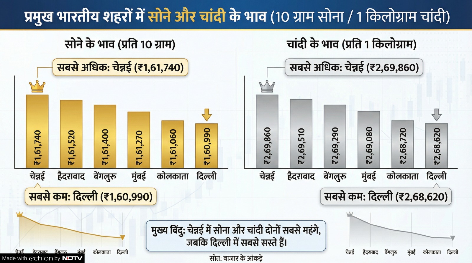 Gold and Today News Today: चांदी की कीमतों में भी आज जोरदार तेजी देखी जा रही है और प्रमुख शहरों में भाव इस प्रकार हैं.चांदी की चमक मुंबई में सबसे ज्यादा है, यहां रेट ₹2,69,080 प्रति किलो है. दिल्ली में चांदी मुंबई के करीब ही ₹2,68,620 प्रति किलो पर कारोबार कर रही है.चांदी के मामले में भी दक्षिण भारत आगे है. चेन्नई में भाव ₹2,69,860 और हैदराबाद में ₹2,69,510 प्रति किलो है. बेंगलुरु में चांदी लगभग ₹2,69,290 के स्तर पर है.कोलकाता में आज चांदी का भाव करीब ₹2,68,720 प्रति किलो चल रहा है.