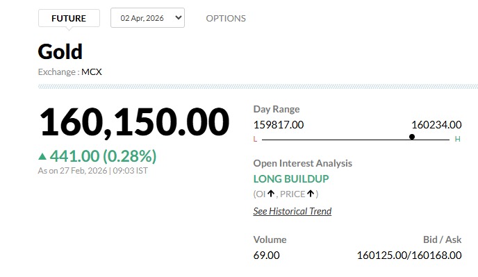 Gold Silver Price Today 27 February 2026 Live Updates: आज, 27 फरवरी को अगर आप सोना या चांदी खरीदने की सोच रहे हैं तो घर से निकलने से पहले अपने शहर का ताजा भाव जरूर जान लें.दिल्ली से लेकर मुंबई, जयपुर, पटना और देश के हर बड़े शहर में रोज सोने और चांदी के दाम बदलते रहते हैं.वहीं, मल्टी कमोडिटी एक्सचेंज (MCX) पर 2 अप्रैल 2026 की डिलीवरी वाला सोना ₹159,968.00 पर है जबकि 5 मार्च 2026 की एक्सपायरी वाली चांदी ₹259,700.00 पर है.