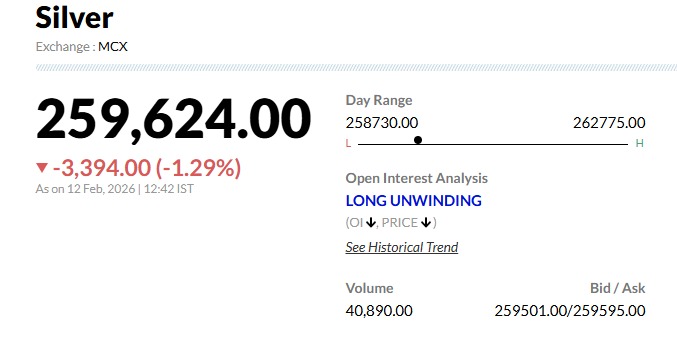 Gold, Silver Prices Today Live Updates: मल्टी कमोडिटी एक्सचेंज (MCX) पर आज सुबह की शुरुआत सुस्ती के साथ हुई है. कल की बड़ी तेजी के बाद आज बाजार खुलते ही सोने और चांदी की कीमतों में गिरावट देखी जा रही है. MCX पर आज सोने और चांदी का हाल आज यानी 12 फरवरी को जैसे ही कमोडिटी मार्केट खुला, सोने और चांदी के भाव लाल निशान में नजर आए. मल्टी कमोडिटी एक्सचेंज पर सुबह लगभग 9:08 बजे, अप्रैल फ्यूचर्स के लिए सोना ₹895 (0.56%) गिरकर ₹1,57,860 प्रति 10 ग्राम पर ट्रेड कर रहा है.