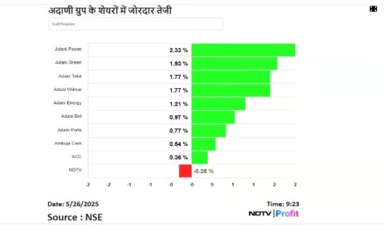 आज के शुरुआती कारोबार में अदाणी ग्रुप के लगभग सभी शेयर हरे निशान में कारोबार कर रहे थे. जिसमें सबसे ज्यादा तेजी अदाणी पावरके शेयरों में देखी गई. अदाणी पावर का शेयर 2 फीसदी से ज्यादा चढ़ गया .वहीं, फ्लैगशिप कंपनी अदाणी एंटरप्राइजेज सहित अदाणी टोटल गैस और अदाणी ग्रीन एनर्जी, अदाणी एनर्जी सॉल्यूशंस 1 फीसदी से ज्यादा तेजी के साथ कारोबार कर रहे थे.