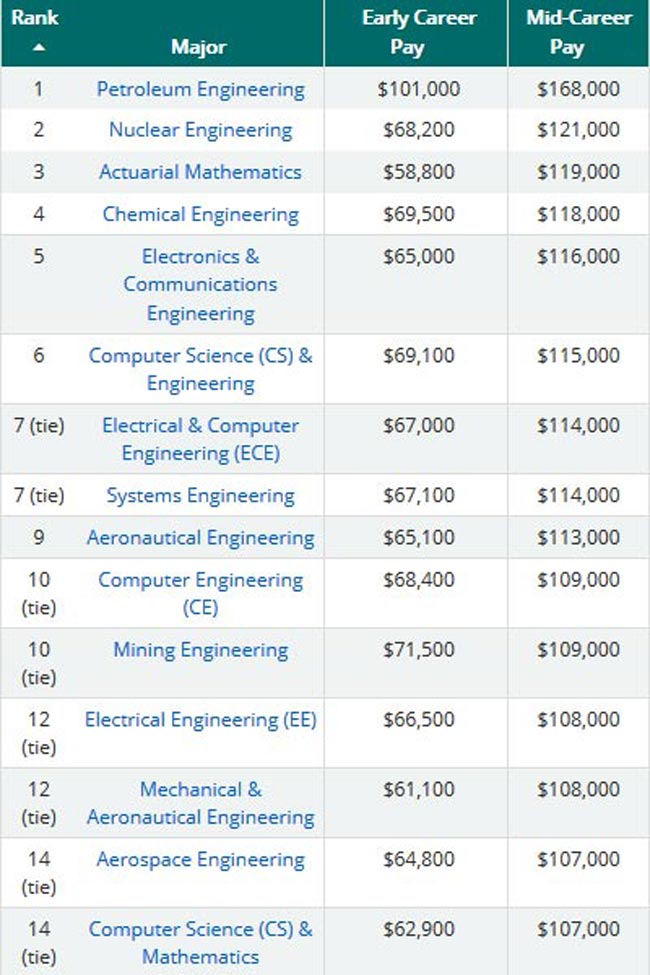 पेट्रोलियम इंजीनियरिंग इस लिस्ट पर सबसे ऊपर है जिसमें एवरेज सैलरी 168,000 अमेरिकी डॉलर सालाना है। यह उस लिस्ट में भी टॉप पर है जिसमें करियर के आरंभ में ही अच्छा वेतन मिलता है। इसके अनुसार 101,000 अमेरिकी डॉलर का एवरेज वेतन मिलता है। इसके कैटेगरी के लिए एवरेज पांच साल का अनुभव पाया गया।