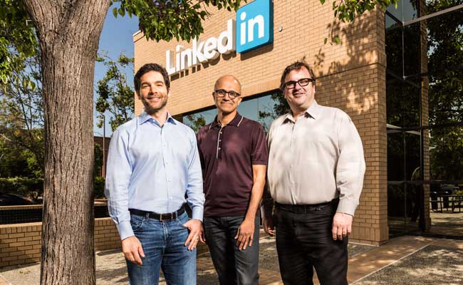 जेफ वेइनर (बाएं) लिंक्डइन के सीईओ बने रहेंगे और सत्य नाडेला (बीच) को रिपोर्ट करेंगे