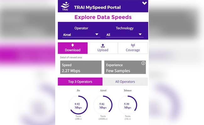 - ट्राई की साइट पर डाउनलोड स्पीड 3 मुख्य ऑपरेटर से बेहतर पर अपलोड स्पीड कम