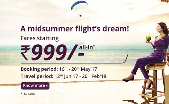 कंपनी ने इस ऑफर का नाम मिडसमर फ्लाइट ड्रीम सेल (Midsummer Flight Dream Sale) रखा है. इसके तहत टिकट की शुरुआती कीमत 999 रुपये (सभी कर सहित) है. यात्री इस सेल का लाभ उठाने के लिए 16 मई से 20 मई तक के बीच टिकट बुक करवा लें. ऑफर के तहत 12 जून 2017 से 20 फरवरी 2018 के बीच यात्रा की जा सकती है.