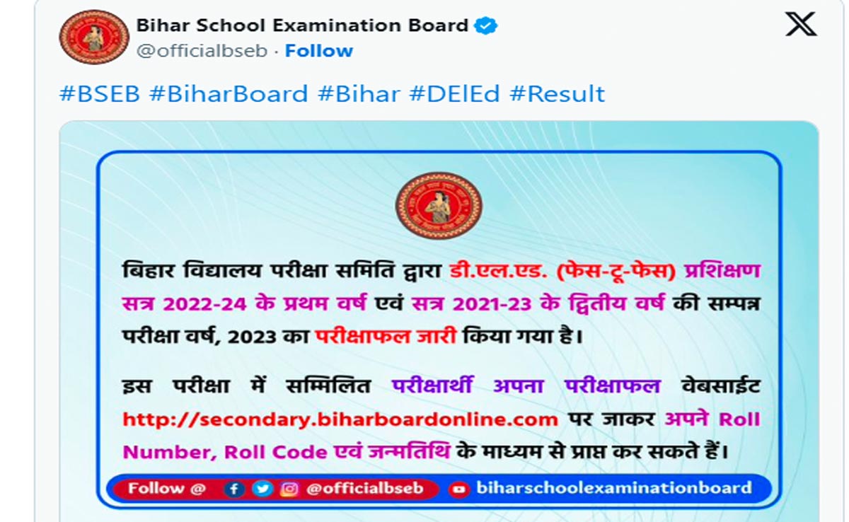 बिहार बोर्ड ने बोर्ड ने ट्विट किया, बिहार विद्यालय परीक्षा समिति द्वारा डीएलएड (फेस टू फेस) प्रशिक्षण सत्र 2022-24 के प्रथम वर्ष और सत्र 2021-23 के द्वितीय वर्ष की सम्पन्न परीक्षा वर्ष 2023 का परीक्षाफल जारी किया गया है. इस परीक्षा में सम्मिलित परीक्षार्थी अपना परीक्षाफल वेबसाइटों पर जाकर अपने रोल नंबर, रोल कोड और जन्म तिथि के माध्यम से प्राप्त कर सकते हैं.