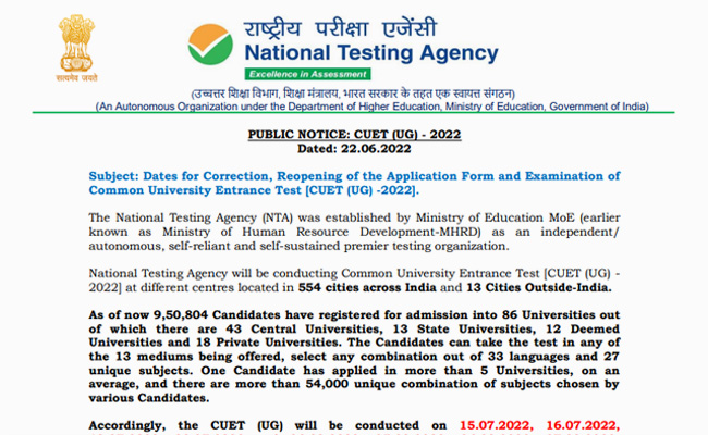 प्रश्न: सीयूईटी यूजी 2022 एग्जाम डेट और टाइम?