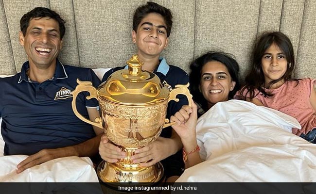 दरअसल तस्वीर में नेहरा का पूरा परिवार साथ में हैं और सबसे खास बात ये है कि आईपीएल की ट्रॉफी भी साथ नजर आ रही है. तस्वीर में नेहरा का पूरा परिवार ट्रॉफी के साथ सोया हुआ है. इस मजेदार तस्वीर को शेयर कर बीवी ने कैप्शन में लिखा, 'सपना पूरा हुआ, नेहरा जी पर सुपरगर्व है और साथ ही पूरी गुजरात टीम पर.'