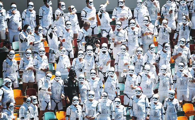 AUS vs IND 4th Test: ब्रिसबेन टेस्ट का दूसरा दिन बारिश की वजह से जल्द खत्म हो गया था लेकिन दूसरे दिन क्रिकेट फैन्स स्टेडियम में एक अलग अंदाज में नजर आए. आखिरी टेस्ट के दूसरे दिन के दौरान दर्शकों को स्टार वॉर्स के किरदारों के कपड़े पहने देखा गया. कई दर्शक 'स्टार वॉर्स' के किरदारों के वेशभूषा (Star Wars Characters) में नजर आए. आईसीसी ने भी तस्वीर को सोशल मीडिया पर शेयर किया जो खूब वायरल हो रहा है, फैन्स भी आईसीसी के द्वारा शेयर की गई तस्वीर पर जमकर कमेंट कर रहे हैं. आईसीसी (ICC) ने तस्वीर शेयर करके लिखा, "दूसरे दिन के बेस्ट ड्रेस अप का अवॉर्ड दिया जाता है.' वहीं, क्रिकेट ऑस्ट्रेलिया ने भी सोशल मीडिया एक वीडियो शेयर किया जिसमें फैन्स 'स्टार वॉर्स' के किरदारों के कपड़े में नजर आ रहे थे. बता दें कि ऑस्ट्रेलिया की टीम ने पहली पारी में 369 रन बनाए जिसमें लाबुशेन ने शानदार शतक जमाया. भारत ने दूसरे दिन के खेल खत्म होने पर 2 विकेट पर 62 रन बनाए थे.