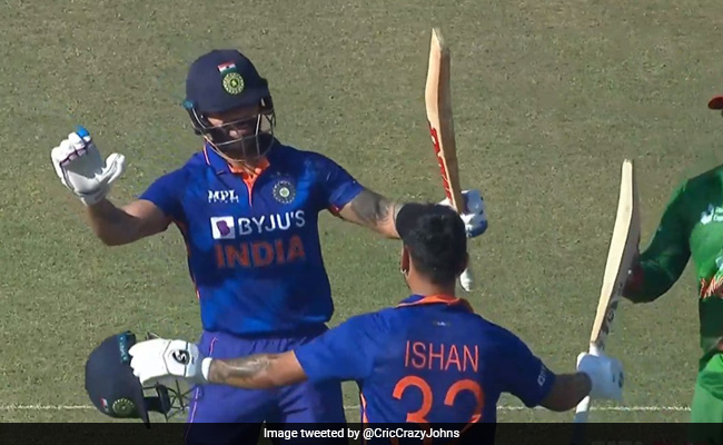 IND vs BAN Ishan Kishan Virat Kohli: तीसरे वनडे में ईशान किशन ने अपने वनडे करियर का पहला दोहरा शतक जड़ा जिसमें उन्होंन 24 चौके और 10 छक्के लगाए. किशन ने कोहली के साथ मिलकर दूसरे विकेट के लिए 290 रनों की साझेदारी की. ईशान 210 रन तो वहीं, कोहली 113 रन बनाकर आउट हुए. दोनों की आतिशी बल्लेबाजी ने फैन्स का दिल जीत लिया. बता दें कि जब ईशान ने अपना दोहरा शतक लगाया तो कोहली पिच पर ही भांगड़ा करते नजर आए. कोहली का अंदाज फैन्स को खूब भा रहा है. यही नहीं अपने पूर्व कप्तान को भांगड़ा करता देख ईशान भी उनके डांस को कॉपी करने की कोशिश करने लग जाते हैं. ईशान के दोहरे शतक पर कोहली का बल्ले उठाकर भांगड़ा करना फैन्स का दिल जीत रहा है. सोशल मीडिया पर फैन्स लगातार रिएक्ट कर रहे हैं.