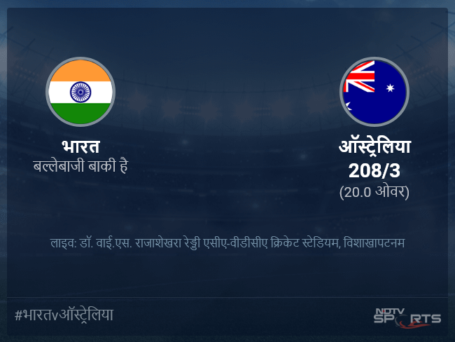 19.6 ओवर (0 रन) एक और डॉट गेंद!! महज़ 5 रन इस आखिरी ओवर से आया| रन आउट का मौका भी मुकेश ने गंवाया लेकिन ये एक कमाल का आखिरी ओवर गुजरा है| इस बार फिर से यॉर्कर का प्रयास था लेकिन लो फुल टॉस हुई| लैप शॉट लगाने गए लेकिन बीट हुए और पैड्स पर खा बैठे| मुकेश ने उसे फील्ड किया| बल्लेबाज़ टिम उस दौरान क्रीज़ के बाहर थे| मुकेश ने थ्रो करना चाहा लेकिन विकटों के काफी पास से निकल गया| इसी के साथ ऑस्ट्रेलिया की पारी 208 रनों पर समाप्त हुई| अब भारत के सामने 209 रनों का लक्ष्य रखा गया है|