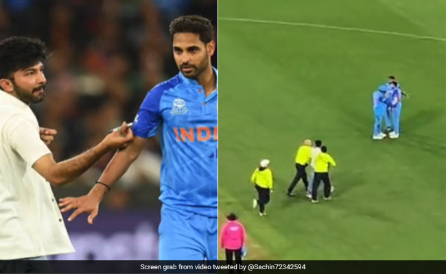 भारत-पाकिस्तान (India vs Pakistan T20 World Cup) के बीच मैच में जहां कोहली और हार्दिक पंड्या की बल्लेबाजी ने महफिल लूटी तो वहीं दूसरी ओर मैच के दौरान पाकिस्तान की पारी के 19वें ओवर में एक शख्स (India vs Pakistan Fan Invades) अचानक मैदान के अंदर जा पहुंचा. दरअसल, 20 वें ओवर की पहली गेंद के बाद फैन मैदान के अंदर जा पहुंचता है और उसे भुवी के पास जाकर उनका ऑटोग्राफ लेने की कोशिश करता है. हालांकि भुवी उस शख्स से दूर रहते हैं. वहीं, फिर तुरंत ही सिक्योरिटी गार्ड एक्शन में आ जाते हैं और फिर शख्स को पकड़कर मैदान से बाहर ले जाते हैं. सोशल मीडिया पर यह वीडियो अब सामने आया है जिसमें शख्स मैदान पर घुसता है और फिर बाद में सिक्योरिटी वाले उसे पकड़कर मैदान से बाहर ले जाते हुए दिखाई देते हैं.