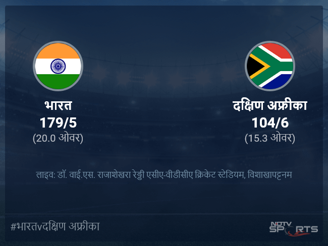 11.6 ओवर (0 रन) डॉट बॉल के साथ हुई एक कसे हुए ओवर की समाप्ति| गेंदबाज़ की तरफ खेला गया शॉट जिसे रोक दिया गया| 78/5 अफ्रीका, लक्ष्य से 102 रन दूर|