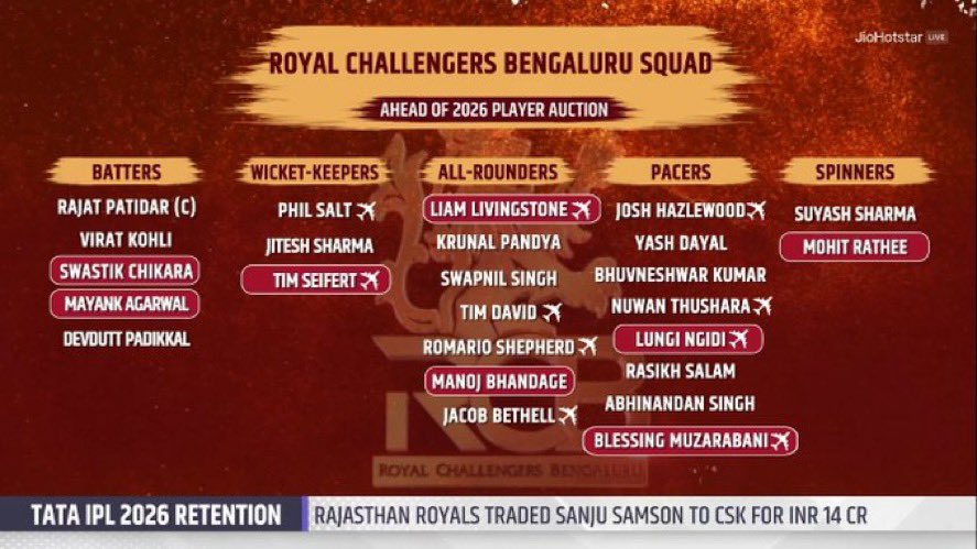 रॉयल चैलेंजर्स बेंगलुरु ने लियाम लिविंगस्टोन को रिलीज किया है. लुंगी एनगिडी काफी हद तक रिजर्व खिलाड़ी थे और उन्हें जाने दिया गया है. उन्होंने यश दयाल को बरकरार रखा है, जिन्होंने 3 जून को आईपीएल फाइनल के बाद से किसी भी प्रकार का क्रिकेट नहीं खेला है. अन्य रिलीज़ों में मयंक अग्रवाल शामिल हैं, जिन्हें घायल देवदत्त पडिक्कल के रिप्लेसमेंट के रूप में अनुबंधित किया गया था. स्वास्तिक चिकारा बिना कोई गेम खेले बाहर चले गए.