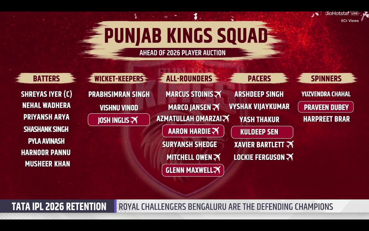 रिलीज खिलाड़ी: ग्लेन मैक्सवेल, जोश इंगलिस, आरोन हार्डी, कुलदीप सेन.