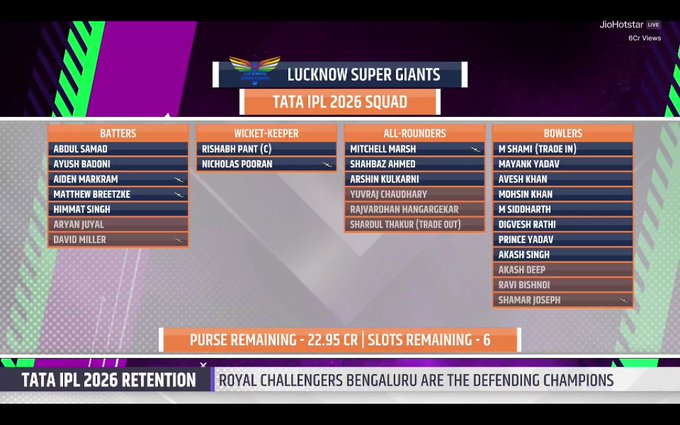 IPL Retention LIVE: लखनऊ सुपर जायंट्स ने इन खिलाड़ियों को किया रिटेन