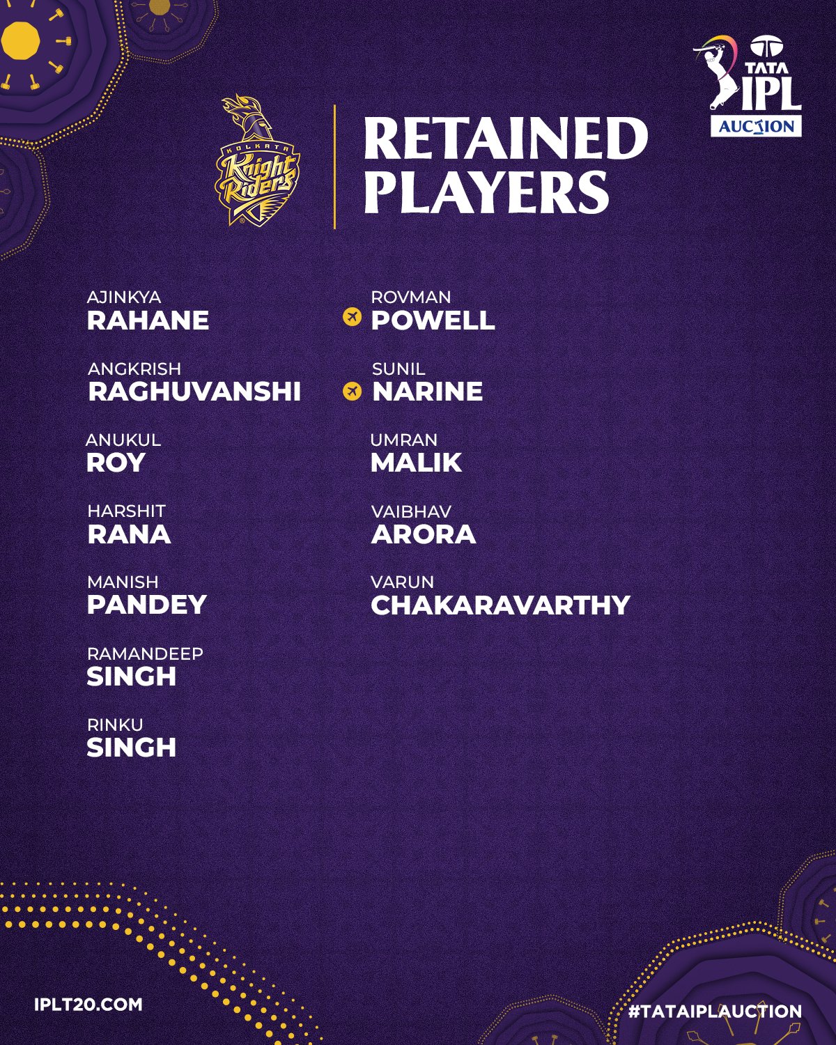 रिटेन खिलाड़ी: रिंकू सिंह, वरुण चक्रवर्ती, सुनील नरेन, हर्षित राणा, रमनदीप सिंह, अंगकृष रघुवंशी, स्पेंसर जॉनसन, रहमानुल्लाह गुरबाज, वैभव अरोड़ा, रोवमैन पॉवेल, अजिंक्य रहाणे, उमरान मलिक, मनीष पांडे, अनुकूल रॉय, लवनिथ सिसौदिया