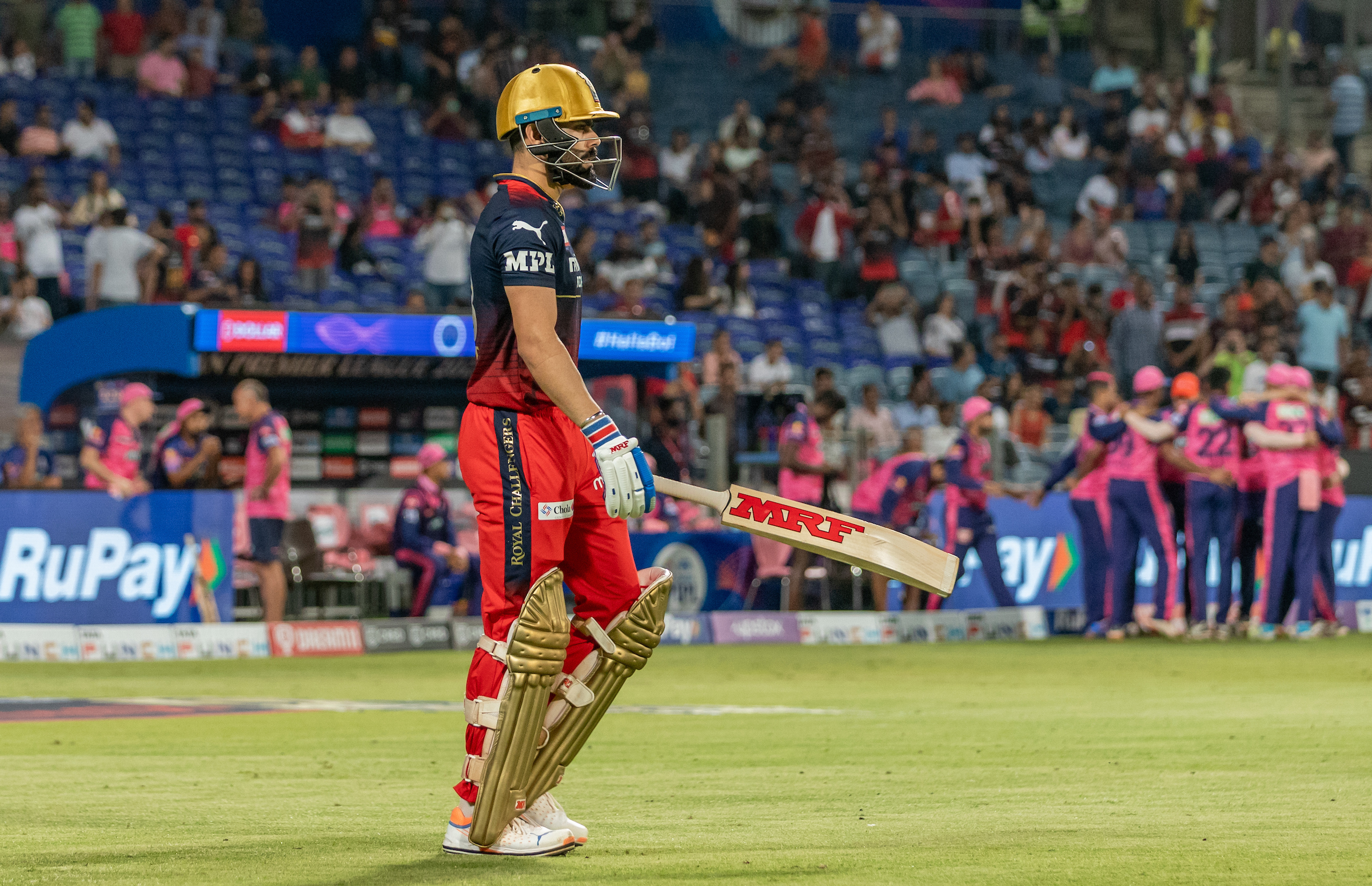 कोहली ने प्रसिद्ध कृष्णा की गेंद पर पुल शॉट खेलने की कोशिश की. उनका बल्ला पहले चल गया और गेंद बल्ले के निचले हिस्से से लगकर प्वाइंट की तरफ गयी जहां रियान पराग ने आसान कैच लपककर उनकी पारी का अंत कर दिया. और कोहली के आउट होते ही उनके चाहने वालों का दिल एक बार फिर से टूट गया, जो उनसे फॉर्म में लौटने की उम्मीद कर रहे थे.