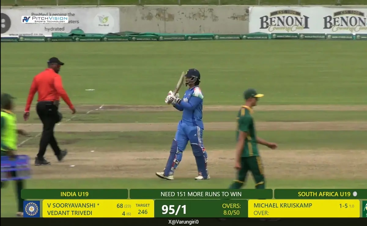 वैभव ने पहले ही गेंद से प्रहार किया. अफ्रीकी टीम से मिले 246 के लक्ष्य का पीछा करने उतरी भारतीय पारी की पहली गेंद एरोन जॉर्ज ने खेली. इसके बाद स्ट्राइक पर वैभव आए और उन्होंने हवाई फायर किया. वैभव ने पहले ओवर में दो छक्के जड़े. वैभव ने 7.1 ओवर में छक्के के साथ अपना अर्द्धशतक पूरा किया. हालांकि, उनकी इस पारी पर अगले ही ओवर में विराम लगा. वैभव ने 24 गेंदों में एक चौके और 10 छक्कों के दम पर 68 रनों की पारी खेली. वैभव जब आउट हुए तब भारत का स्कोर 95/2 था.