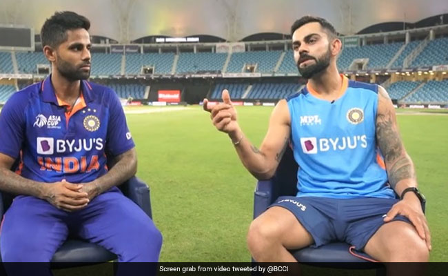 Suryakumar Yadav and Virat Kohli: हांगकांग के खिलाफ मैच में भारत को 40 रनों से जीत मिली. भारत की जीत में सूर्यकुमार यादव ने कमाल किया और 26 गेंद पर नाबाद 68 रन की पारी खेली तो वहीं विराट कोहली ने 44 गेंद पर 59 रन की पारी खेली, दोनों ने मिलकर तीसरे विकेट के लिए 98 रन पार्टनरशिप की जिसके दम पर भारत की टीम 20 ओवर में 2 विकेट पर 192 रन बना पाने में सफल रही. बता दें कि मैच के बाद कोहली ने सूर्यकुमार यादव का इंटरव्यू किया. कोहली ने (Suryakumar Yadav and Virat Kohli Interview Video) इंटरव्यू के दौरान सूर्यकुमार को उनके शानदार बल्लेबाजी के लिए बधाई दी.