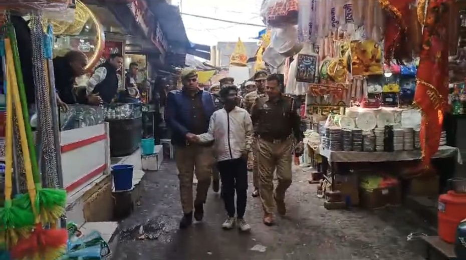 इस दौरान रास्ते के दोनों ओर पड़ने वाले दुकानदार आरोपी को देखते नजर आए.