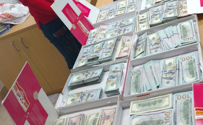 जिसको महिला ने अपने हैड बैग में रखे मिठाई के डिब्बे में गु्प्त तरीके से छिपा रखा था. डिब्बे में 100 और 50 के अमरीकी डालर छिपाने के लिए एक विशेष रुप से एक तल बनाया गया था.