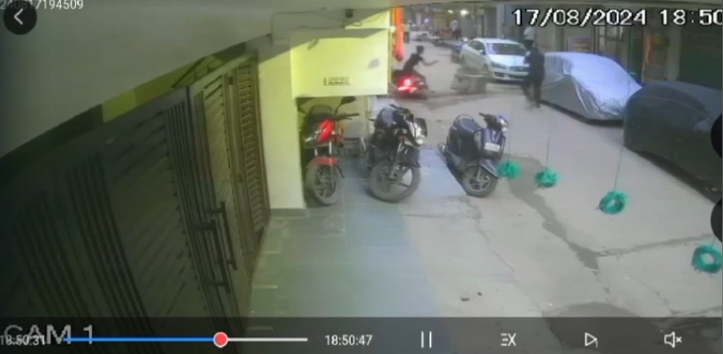 सीसीटीवी कैमरे में कैद इस घटना में नजर आ रहा है कि दो युवक एक इमारत के नीचे मौजूद हैं. इनमें से एक युवक स्कूटी पर बैठा है और ऐसा लग रहा है कि दूसरा उसके साथ बातचीत कर रहा है.