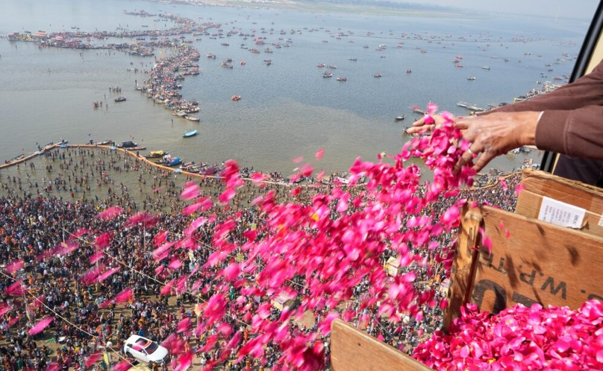 माघ मेला में हेलीकाप्टर से हुई श्रद्धालुओं पर पुष्प वर्षा