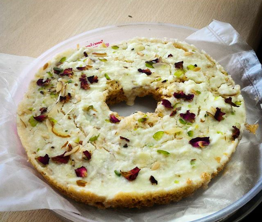 आटा, घी, बर्फ के टुकड़े, पानी, दूध, फूड रंग (पीला), सिरप के लिए, चीनी, इलायची पाउडर, बादाम और पिस्ता, और केसर जैसी सामग्री की आवश्यकता होती है.