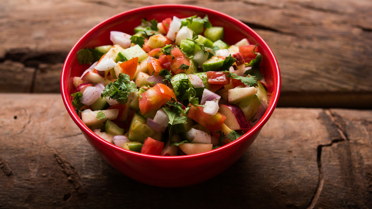 Kachumber Salad Recipe: आपने मार-मार कर कुचुम्बर निकालना तो सुना होगा लेकिन कुचुम्बर सलाद रेसिपी के बारे में शायद ही सुना हो. कुचुम्बर मतलब बेसिकली अच्छी तरह से मैस्ड होता है, जिसमें कई सारी चीजें शामिल होती हैं. कुचुम्बर सलाद रेसिपी के नाम से पता चलता है, इस स्वादिष्ट सलाद को बनाने के लिए 3-4 प्रकार के खाद्य पदार्थों का उपयोग किया जाएगा. इस सलाद की सबसे खास बात है इसकी सारी सामाग्री किचन से ही मिल जाएगी. इसमें आप पसंद के फूड आइटम को जोड़ भी सकते हैं और हटा भी सकते हैं. इसके अलावा इस सलाद की एक और खास बात है कि इसे बनाने में महज 10 मिनट का समय लगता है, तो आइये जानते हैं इसकी रेसिपी...