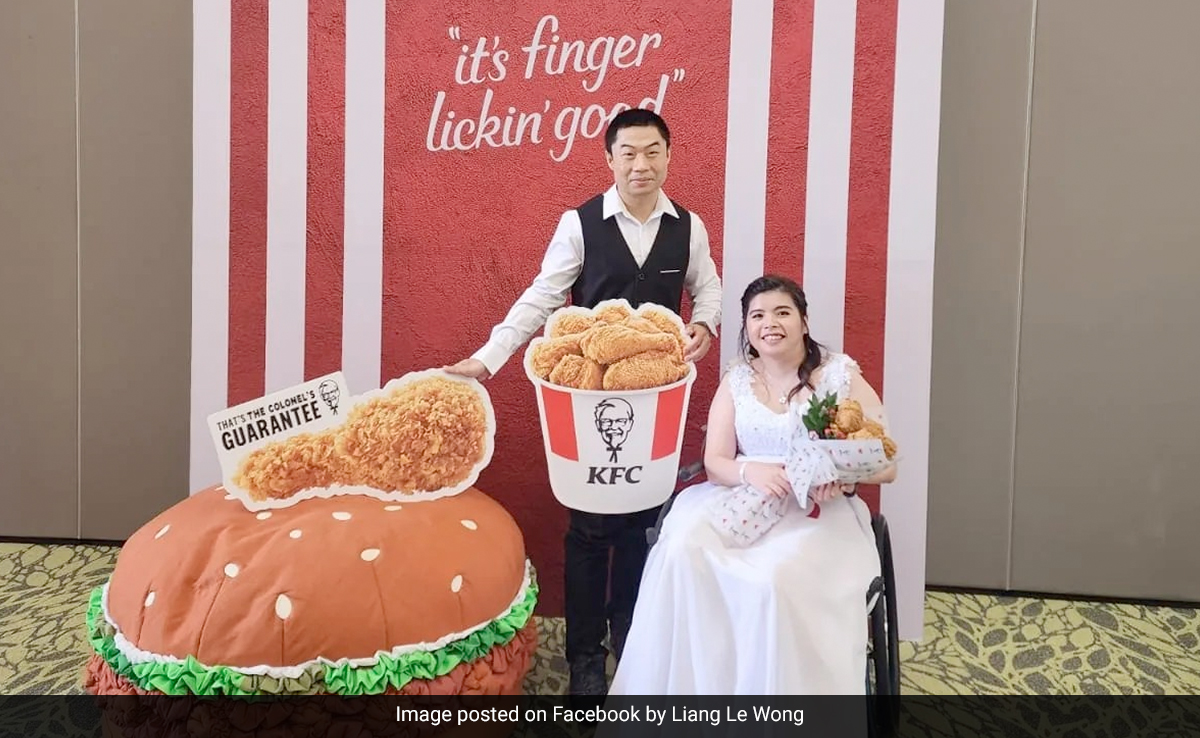 फेसबुक यूजर लियांग ले वोंग ने प्लेटफॉर्म पर "अपने सपनों की शादी" की तस्वीरें और वीडियो साझा किए हैं. 'उंगली चाटने वाले अच्छे' रिसेप्शन में तई तरीकों से पॉपुलर ब्रांड के मोटिफ और सिग्नेचर व्यंजनों को शामिल किया गया. दूल्हा और दुल्हन जिंजर बर्गर के विशाल कट-आउट, चिकन विंग्स बकेट के साथ-साथ क्रिस्पी चिकन के एक अलग पीस के साथ पोज देते नजर आ रहे हैं. थीम से मेल खाने के लिए बैकग्राउंड में ब्रांड की सफेद और लाल धारियां प्रतिबिंबित थीं.