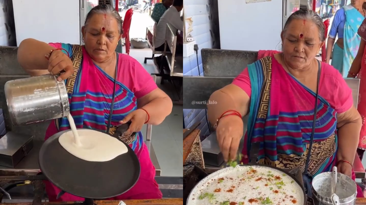 डोसा एक ऐसी डिश है जिसे दुनिया भर में पसंद किया जाता है. डोसा, एक पारंपरिक साउथ भारतीय व्यंजन है, जो फर्मेंटेड चावल और दाल के बैटर से बनाया जाता है. यह पतला और कुरकुरा व्यंजन आम तौर पर सांबर और चटनी के साथ सर्व किया जाता है, जो देसी खाने के शौकीनों को बहुत पसंद आता है. मसाला डोसा से लेकर रवा डोसा तक डोसा की कई किस्में, भोजन प्रेमियों को पसंद करती हैं. हाल ही में हमारी नजर हेलीकॉप्टर डोसा वाले एक वायरल वीडियो पर पड़ी. अहमदाबाद की एक बुजुर्ग महिला यह डिश बनाकर अपने ग्राहकों को सर्व कर रही थी.