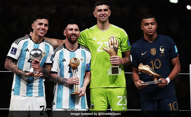 FIFA World Cup 2022 Awards: आखिरकार लियोनेल मेस्सी (Lionel Messi) का विश्व कप जीतने का अधूरा सपना पूरा हुआ. एक ऐसा सपना जो उनके साथ पूरी दुनिया ने देखा और उसके पूरे होने की दुआ की. केरल से लेकर कश्मीर तक भारत भर में और दुनिया के हर कोने में इस फाइनल ने पूरी दुनिया को मेस्सी के रंग में रंग दिया. बेहद ही रोमांचक फाइनल में अर्जेंटीना ने फ्रांस को पेनल्टी शूटआउट में 4-2 से हराकर तीसरा बार विश्व चैंपियन का खिताब अपने नाम करने में सफलता हासिल की. बता दें कि फाइनल मैच का रोमांच इतना चरम पर था कि दो बार मैच रेफरी को एक्स्ट्रा टाइम में मैच को ले जाना पड़ा लेकिन उसमें भी दोनों टीम गोल नहीं कर पाई. जिसके बाद आखिर में शूटआउट से परिणाम निकाला गया जिसमें किस्मत ने अर्जेंटीना का साथ दिया. बता दें कि विश्व कप के खत्म होने पर खिलाड़ियों को तमाम अवार्ड्स से भी नवाजा गया.