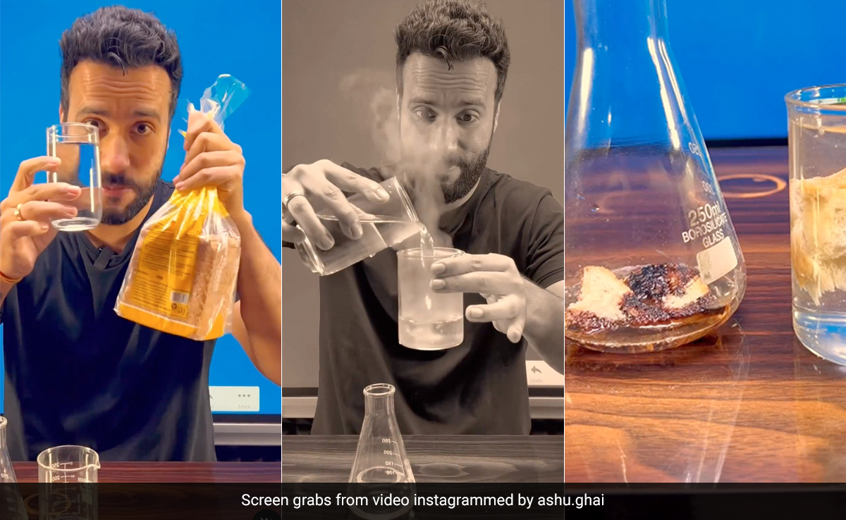 इसे समझाने के लिए इंफ्लूएंसर ने एक बीकर और एक जार लिया है. बीकर में डाइजेस्टिव एंजाइम्स जैसे केमिकल हैं. जिन्हें पानी मिलाकर डायल्यूट नहीं किया है. जबकि जार में उसी सॉल्यूशन को लिया है, लेकिन उसे पानी डालकर डायल्यूट कर दिया है. इसके बाद दोनों में ही ब्रेड के कुछ पीसेज डाले गए हैं. आप देख सकते हैं बीकर में मौजूद ब्रेड का पीस बर्न होना शुरू हो गया. जबकि जार में मौजूद ब्रेड का पीस वैसा का वैसा ही है.
