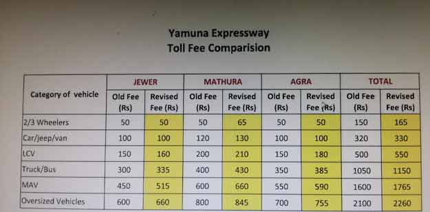 मिनी बसों और हल्के वाहनों (एलसीवी) के लिए 1150 रुपये और मल्टी एक्सल वाहनों के लिए 2260 रुपये टोल हो गया है। टोल चार्ज करने की सबसे अधिक राशि 1765 रुपये बड़े या मल्टी एक्सल वाहनों के लिए है। ग्रेटर नोएडा और आगरा के बीच एक ही दिन की यात्रा के लिए दो पहिया वाहनों से 265 रुपये, चार पहिया वाहनों से 530 रुपये, एलसीवी और मिनी बसों के 880 रुपये और बस और ट्रकों से 1840 रुपये, मल्टी एक्सल वाहनों से 2825 रुपये शुल्क लिया जाएगा। ऊपर के आकार वाहनों को 3615 का भुगतान करना होगा। एक्सप्रेस-वे के टोल प्लाजा पर अब तक पुराने टोल की सूची लगी है। इससे यात्रियो में भ्रम की स्थिति है। अधिक टोल वसूलने को लेकर यात्रियों व टोल प्लाजाकर्मियों में कहासुनी भी हो रही है।
