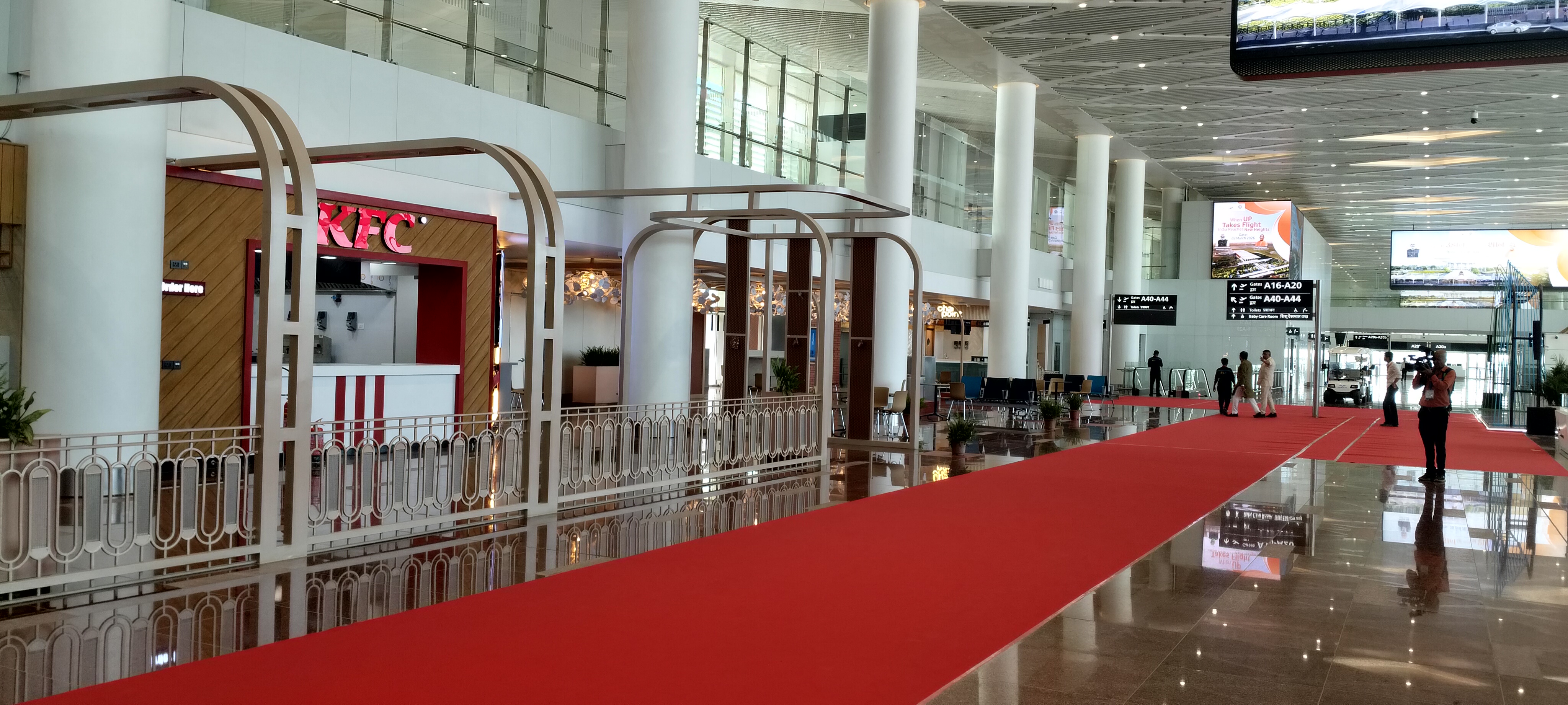 - एयरपोर्ट का डिजाइन यूपी की सांस्कृतिक विरासत, स्थानीय लाल ग्रेनाइट पत्थर से प्रभावित है