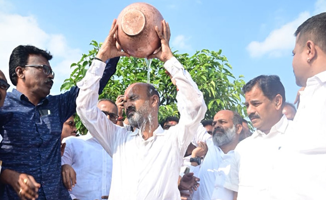 तेलंगाना के एक शीर्ष बीजेपी नेता शुक्रवार को गीले कपड़ों में यह शपथ लेने के लिए एक मंदिर पहुंचे कि राज्य के बीजेपी प्रमुख के तौर पर वे तेलंगाना राष्ट्र समिति (TRS)की सरकार को अस्थिर करने की किसी कोशिश में शामिल नहीं थे. वीडियोज में तेलंगाना के बीजेपी प्रमुख बांडी संजय को अपने ऊपर पानी उड़ेलते और मंदिर के पुजारी के समक्ष शपथ लेते हुए देखा जा सकता है. संजय ने इस दौरान सीएम के. चंद्रशेखर राव का इंतजार भी किया जिन्हें भी संजय ने ऐसा करने की चुनौती दी थी.