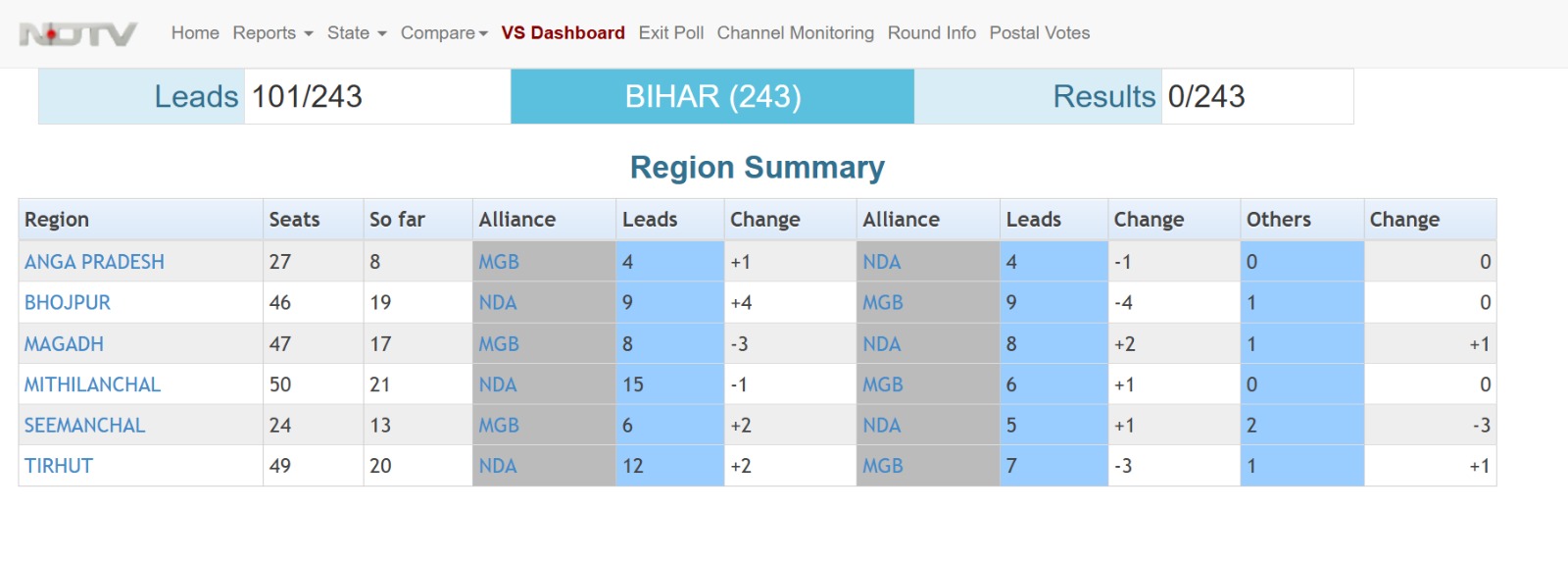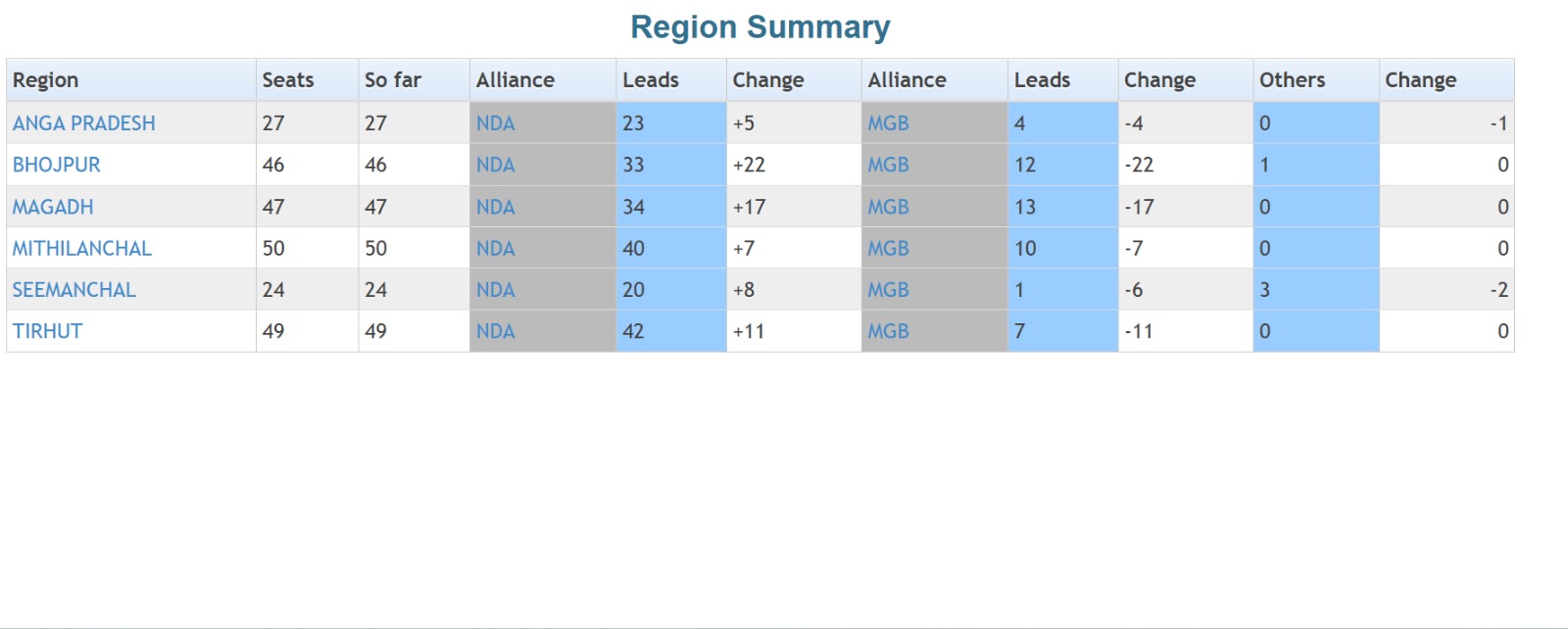 बिहार में सभी 243 सीटों के रुझान आ गए हैं. इनमें 160 सीटों पर एनडीए को बढ़त है. महागठबंधन को 79 सीटों पर बढ़त है. वहीं अन्य 4 सीटों पर आगे हैं.