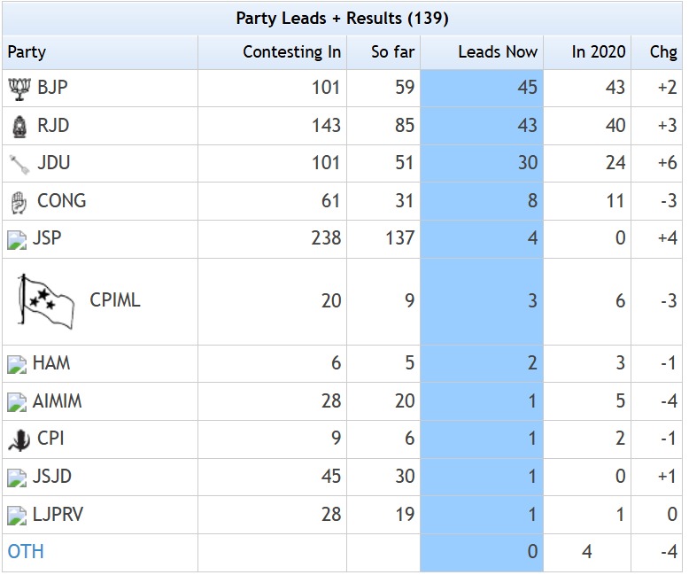 चुनाव आयोग के आंकड़े के मुताबिक जेडीयू 51 सीटों पर, BJP 48 सीटों पर और राजद 25 सीटों पर आगे है.