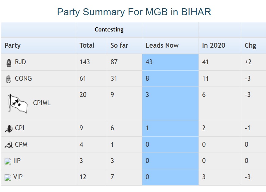 महागठबंधन में कांग्रेस सबसे कमजोर कड़ी के तौर पर दिखाई दे रही है. कांग्रेस 11 सीटों पर आगे है. उसे 5 सीटों का नुकसान होता दिखाई दे रहा है. 2020 में कांग्रेस के पास 16 सीटें थीं.
