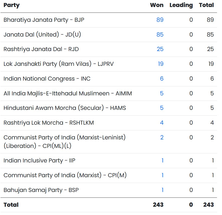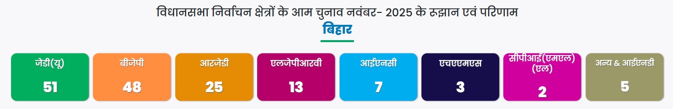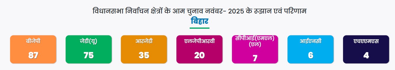 चुनाव आयोग की आधिकारिक वेबसाइट पर भी बिहार विधानसभा चुनाव 2025 के सभी सीटों का रिजल्ट घोषित किया जा चुका है. बीजेपी बिहार में विधायकों की संख्या के हिसाब से सबसे बड़ी पार्टी बन चुकी है.