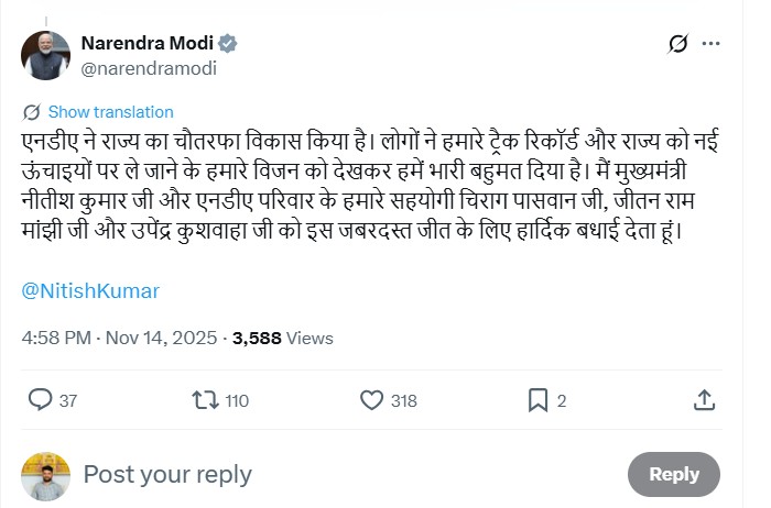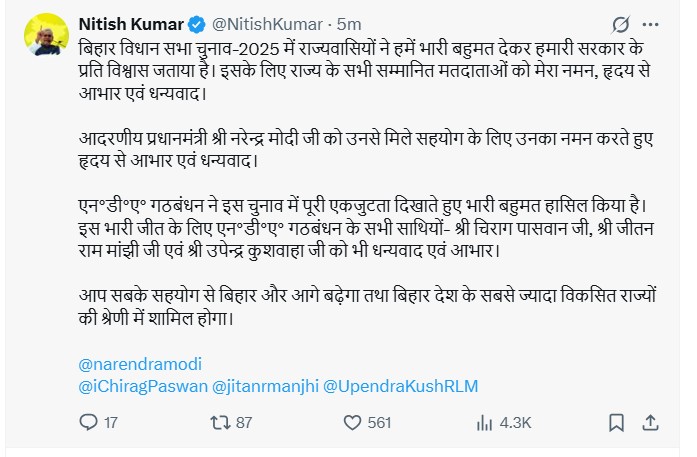 जन सुराज पार्टी के प्रवक्ता पवन वर्मा ने कहा कि नीतीश कुमार इन चुनावों के 'एक्स' फैक्टर थे. लोगों ने मान लिया था कि नीतीश कुमार का युग समाप्त हो गया है. नीतीश कुमार पिछले 20 वर्षों से मुख्यमंत्री हैं. लालू के जंगल राज के बाद नीतीश का सबसे बड़ा योगदान कानून-व्यवस्था को बहाल करना था, उनका अपना व्यक्तित्व है, कोई वंशवाद की राजनीति नहीं, व्यक्तिगत ईमानदारी, उन्हें 'सुशासन बाबू' नाम दिया गया था और वे इस देश के समाजवादी आंदोलन की सबसे परिष्कृत उपज हैं. वर्मा ने कहा कि उनका व्यक्तित्व ऐसा था कि वे भविष्य के प्रधानमंत्री हो सकते थे, बिहार की महिलाओं को उन पर भरोसा है.