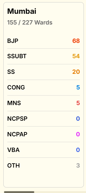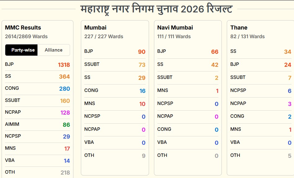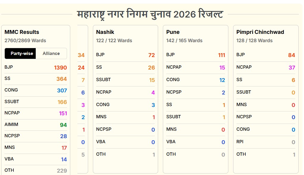 देश के सबसे अमीर नगर निकाय, बृहन्मुंबई महानगरपालिका (BMC) के नतीजों पर न केवल महाराष्ट्र बल्कि पूरे देश की नजर थी. पिछले दो दशकों से अधिक समय से यहां शिवसेना का दबदबा रहा है, लेकिन पार्टी में फूट के बाद यह पहली बार है जब मतदाताओं ने उद्धव ठाकरे और एकनाथ शिंदे के नेतृत्व के बीच बीजेपी गठबंधन को चुना है. इसके अलावा नागपुर के नतीजे भी शानदार रहे हैं, बीजेपी ने अकेले यहां बहुमत के 102 का आंकड़ा छू लिया है.