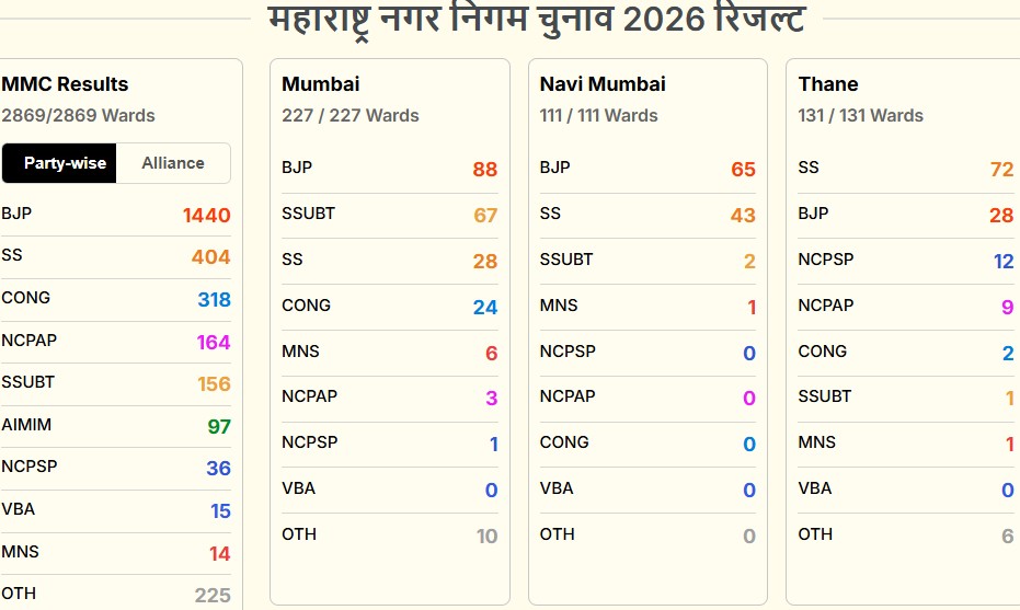 Maharashtra Civic Polls, BMC Election 2026 Vote Counting LIVE Updates: महाराष्ट्र की राजनीति के लिए 'मिनी विधानसभा' कहे जाने वाले 29 महानगरपालिकाओं के चुनावी दंगल में बीजेपी ने बाजी मार ली है. 1441 वार्डों में जीत के साथ बीजेपी पहले नंबर पर है. वहीं मुंबई बीएमसी में बीजेपी गठबंधन ने बहुमत से ज्यादा 119 वार्ड जीतकर सभी का चौंका दिया है. वहीं उद्धव राज गठबंधन मिलकर भी 72 सीटें ही ला सके. वहीं कांग्रेस ने 24 सीटें हासिल की हैं. सबसे बुरा प्रदर्शन शरद पवार की एनसीपी का रहा. पार्टी ने सिर्फ 1 वार्ड ही जीता है.
