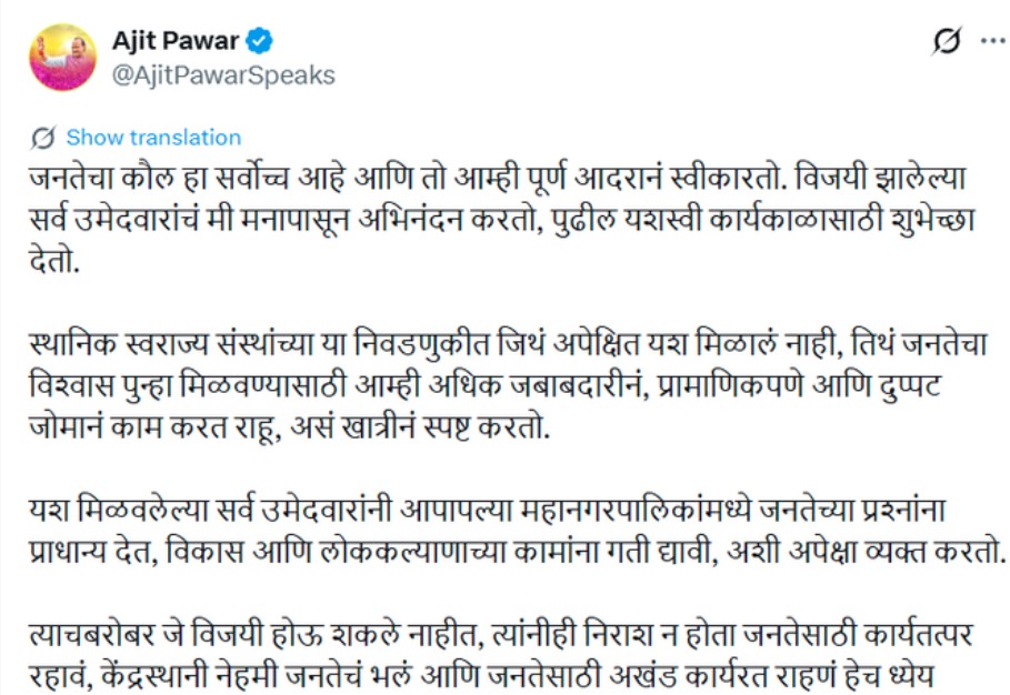 महाराष्ट्र नगर निकाय चुनाव में 164 सीटें जीतने वाले अजीत पवार ने ट्वीट कर कहा कि जनता की इच्छा सर्वोपरि है और हम इसे पूरे सम्मान के साथ स्वीकार करते हैं. मैं सभी विजयी उम्मीदवारों को दिल से बधाई देता हूं और उनके सफल कार्यकाल के लिए शुभकामनाएं देता हूं.