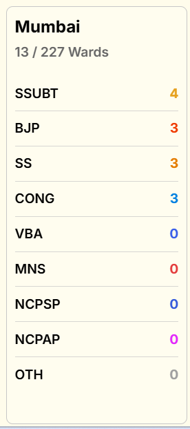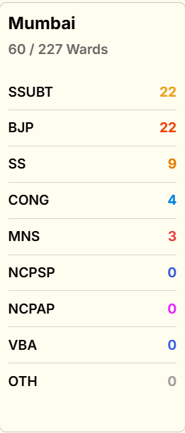 BMC के ताजा रुझानों में भाजपा और शिवसेना (UBT) बराबरी पर हैं. दोनों दल 22-22 सीटों पर बढ़त बनाए हुए हैं.
