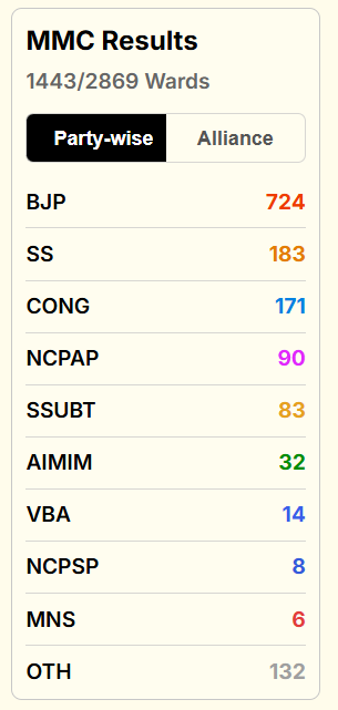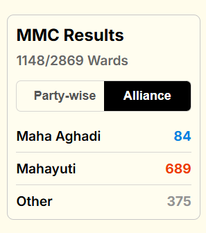 महाराष्ट्र के 29 शहरों के 2869 वार्डों पर हो रहे चुनाव में 1148 के रुझान आ चुके हैं. अब तक महायुति 689 पर आगे चल रही है. जबकि महाविकास अघाड़ी 84 वार्ड में बढ़त बनाए हुए है.