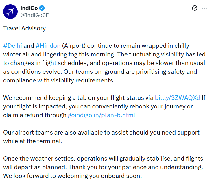 हो सकते हैं। हमारी ग्राउंड टीमें सुरक्षा और विजिबिलिटी की ज़रूरतों का पालन करने को प्राथमिकता दे रही हैं... मौसम ठीक होने के बाद, ऑपरेशन धीरे-धीरे सामान्य हो जाएंगे, और फ्लाइट्स प्लान के मुताबिक उड़ान भरेंगी..."
