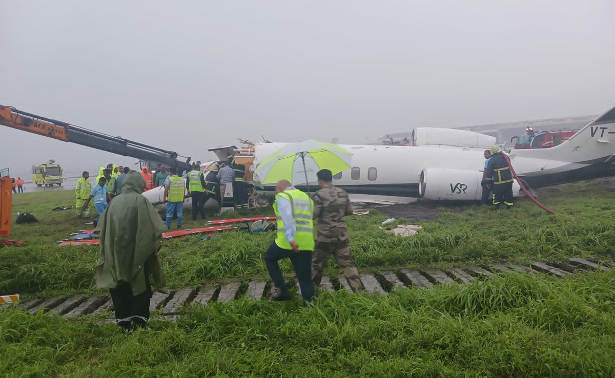 नागर विमानन महानिदेशालय (DGCA) ने बताया कि विशाखापत्तनम से मुंबई के लिए उड़ान भरने वाला वीएसआर वेंचर्स लियरजेट 45 विमान वीटी-डीबीएल मुंबई एयरपोर्ट के रनवे 27 पर उतरते समय फिसल गया. प्लेन में 6 यात्री और 2 क्रू मेंबर थे. DGCA ने बताया कि हादसा भारी बारिश के कारण हुआ. बारिश की वजह से विजिबिलिटी 700 मीटर थी.