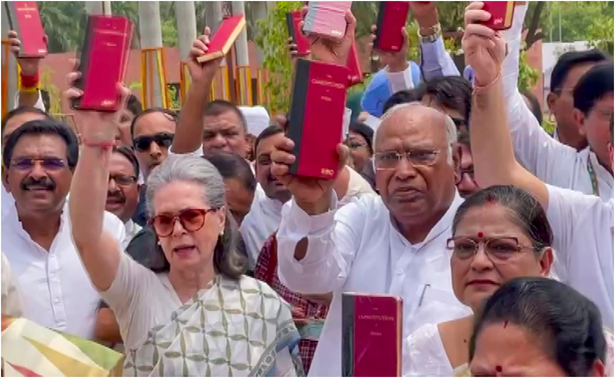 संविधान के कोट पॉकेट संस्करण के साथ संसद परिसर में प्रदर्शन करते कांग्रेस सांसद.